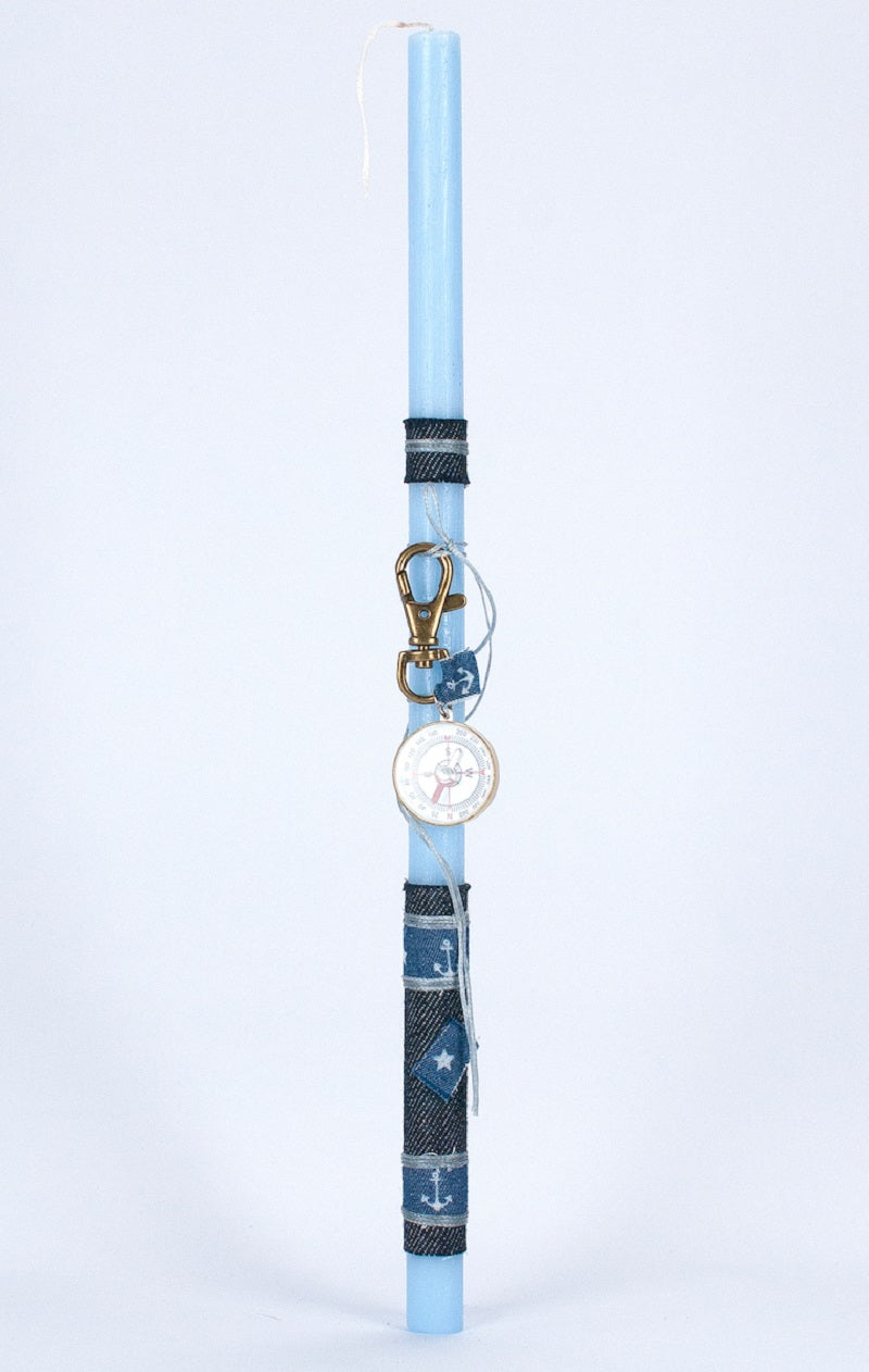 Λαμπάδα στρογγυλή με μίνι μπρελόκ πυξίδα με μπεζ ή μπλέ τσουβάλι-ύφασμα. Ηλικία: 3+