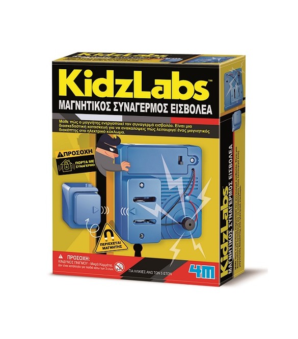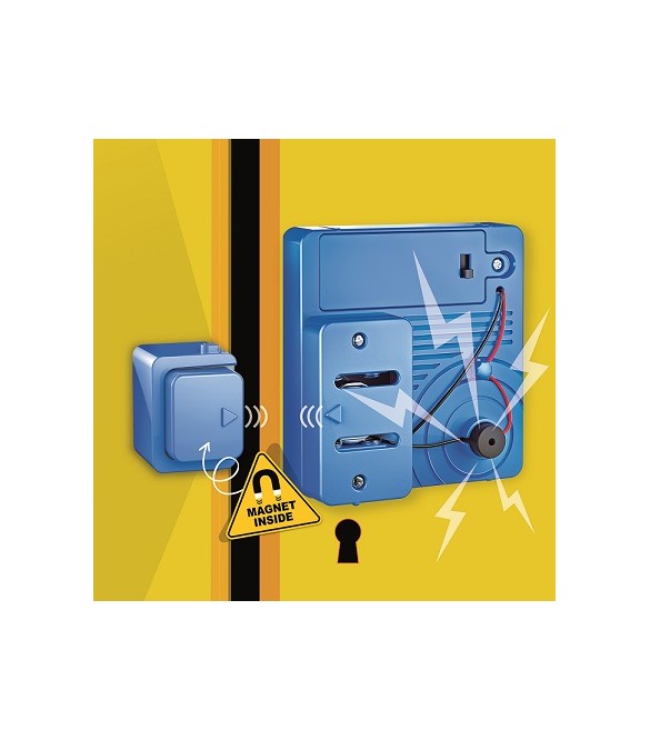 Μάθε πώς o μαγνήτης ενεργοποιεί τον Συναγερμό Εισβολέα! Μια διασκεδαστική κατασκευή για να ανακαλύψεις πώς λειτουργεί ένας μαγνητικός διακόπτης στο ηλεκτρικό κύκλωμα! ΤΡΟΠΟΣ ΛΕΙΤΟΥΡΓΙΑΣ: Ενεργοποίησε τον συναγερμό και κλείσε την πόρτα. Αν κάποιος ανοίξει την πόρτα έστω και μια μικρή χαραμάδα, ο συναγερμός θα χτυπήσει. Κλείσε ξανά την πόρτα ή απενεργοποίησε τον συναγερμό για να σταματήσει ο βομβητής. Όταν η πόρτα είναι κλειστή και τα τρίγωνα στην υποδοχή του μαγνήτη και τη βάση ευθυγραμμίζονται, ο δίσκος έλκεται από τον μαγνήτη στη μία πλευρά της περιοχής με τις τρύπες. Όταν ανοίξει η πόρτα, ο μαγνήτης απομακρύνεται από τη βάση και η έλξη από τον μαγνήτη δεν είναι πλέον αρκετά ισχυρή για να συγκρατήσει τον δίσκο. Ο δίσκος κυλά προς τα κάτω, στο κάτω μέρος της περιοχής των τρυπών, και παραμένει ανάμεσα στις δύο πλάκες με τις τρύπες. Αυτό λειτουργεί σαν διακόπτης, συμπληρώνοντας το κύκλωμα και επιτρέποντας τη ροή ρεύματος μέσω του βομβητή. ΠΕΡΙΕΧΟΜΕΝΑ: Μέρος Α: Βάση x 1, Μέρος Β: Κάλυμμα x 1, Μέρος Γ: Μαγνήτης x 1, Μέρος Δ: Υποδοχή μαγνήτη x 1, Μέρος E: Σετ πλάκας με τρύπες x 1, Μέρος ΣΤ: Κάλυμμα μπαταρίας x 1, Μέρος Ζ: Κολλητική ταινία, Μέρος Η: Μεταλλικός δίσκος x 1, Μέρος Θ, Τερματικά καλύμματα x 3, Μέρος Ι: Βίδες x 3, Μέρος K: Βίδες ροδέλας x 2. Επίσης, απαιτούνται αλλά δε συμπεριλαμβάνονται σε αυτήν τη συσκευασία: 2 μπαταρίες ΑΑΑ 1,5 V, ένα μικρό στραβοκατσάβιδο. Περιέχονται οδηγίες στα Ελληνικά. Διαστάσεις Συσκευασίας (Μ x Π x Y): 17 x 22 x 6 εκ. Ηλικία: 5+