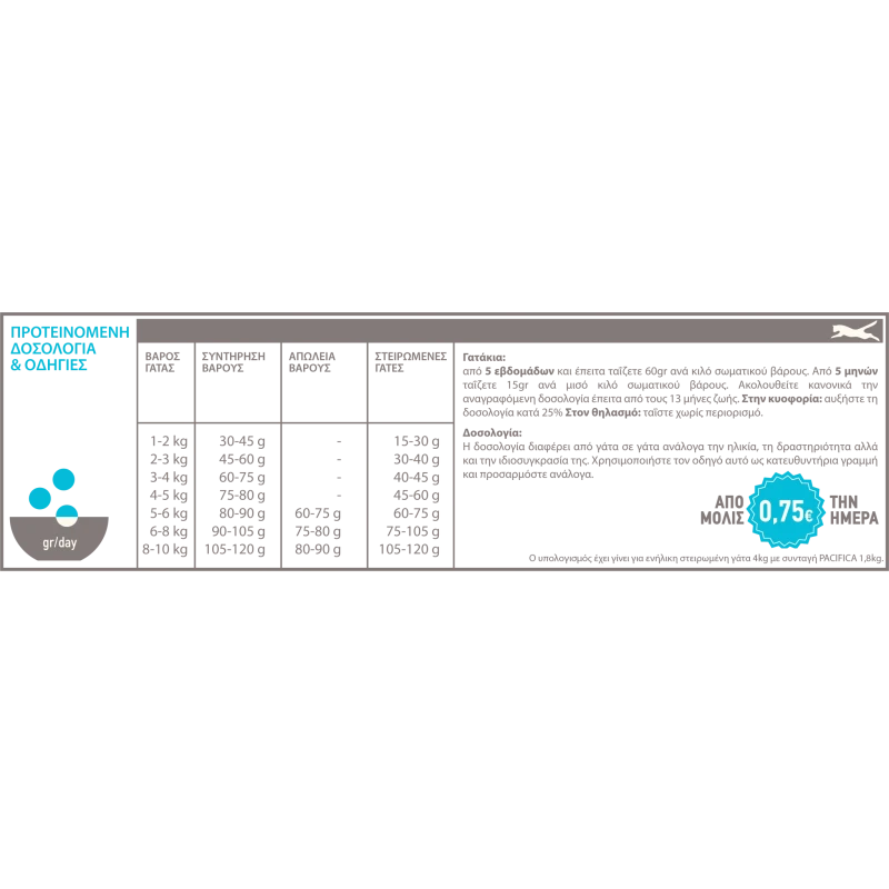 Ανάλυση: Ακατέργαστη πρωτεΐνη (ελαχ.) 37% Περιεκτικότητα σε λίπος (ελαχ.) 20% Ακατέργαστη Τέφρα (ελαχ.) 7,5% Ακατέργαστες Ινώδεις Ουσίες (μεγ.) 3% Υγρασία (μεγ.) 10% Ασβέστιο (ελαχ.) 1,5% Φώσφορος (ελαχ.) 1,1% Μαγνήσιο (μεγ.) 0,1% Ταυρίνη (ελαχ.) 0,15% Ωμέγα-6 / Ωμέγα-3 (ελαχ.) 2% / 2,2% DHA / EPA (ελαχ.) 1% / 0,8%