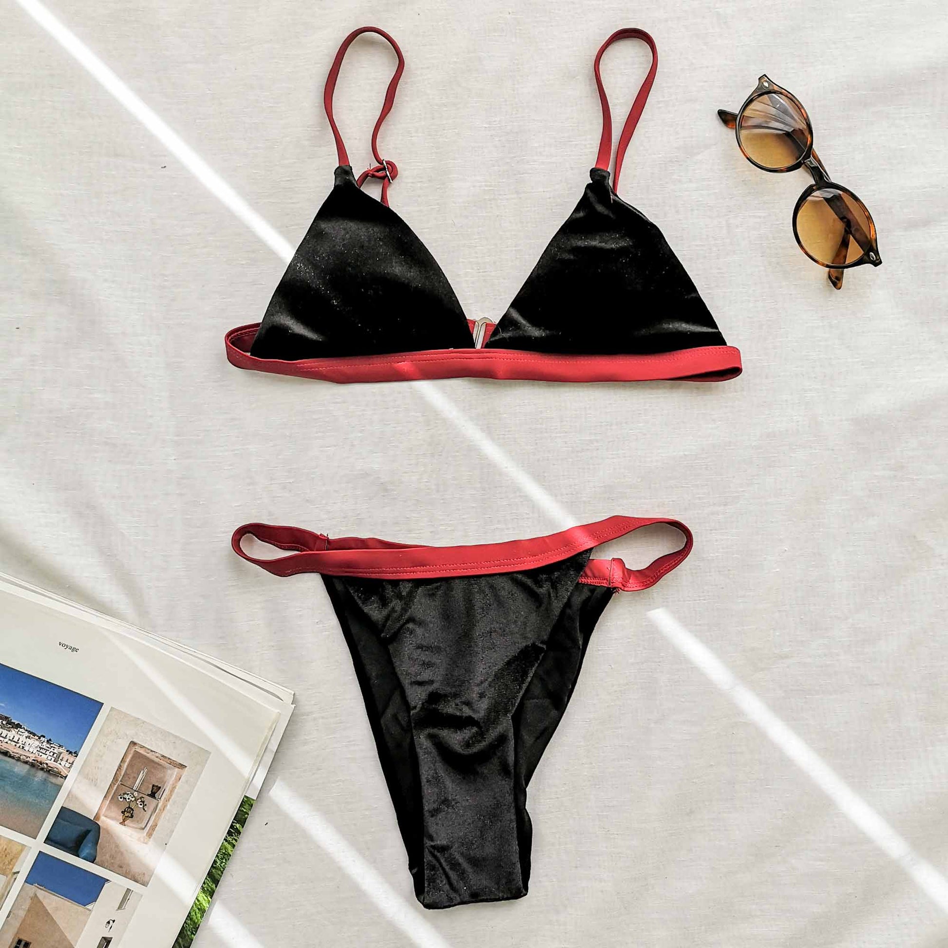 SWI-069 Μαγιό μπικίνι τριγωνάκι βελουτέ μαύρο με μπορντό λάστιχο