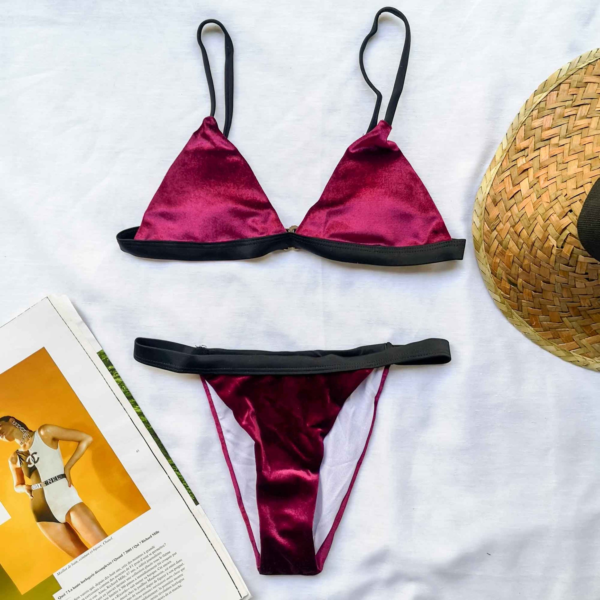 Μαγιό μπικίνι τριγωνάκι βελουτέ μπορντό με μαύρο λάστιχο