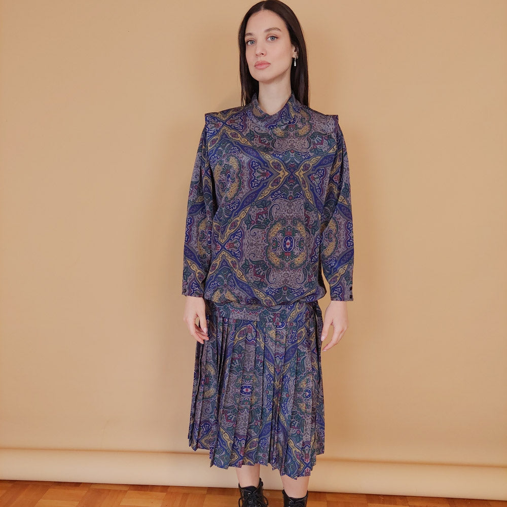 ΑΝΑΓΡΑΦΟΜΕΝΟ ΜΕΓΕΘΟΣ: UK 12 ΠΡΟΤΕΙΝΟΜΕΝΟ ΜΕΓΕΘΟΣ: L-XL ΣΥΝΘΕΣH: 100% polyester VINTAGE ΚΑΤΑΣΤΑΣΗ: Εξαιρετική ΛΕΠΤΟΜΕΡΕΙΕΣ: Μοναδικό κομμάτι, φόδρα, πλισέ φούστα. To μοντέλο μας είναι S, έχει ύψος 1.70.