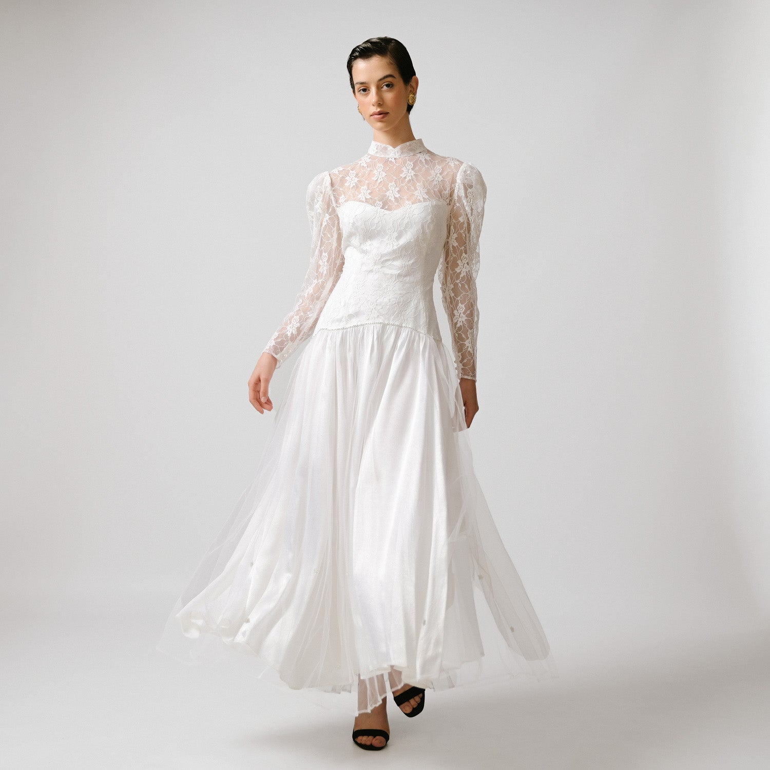 ΠΕΡΙΓΡΑΦΗ ΠΡΟΪΟΝΤΟΣ: Vintage λευκό νυφικό μέχρι τον αστράγαλο με δαντέλα και τούλι, ελαφρώς φουσκωτά μανίκια, στενή χαμηλή μέση με ραμμένες χαντρούλες, κλείνει πίσω με υφασμάτινα κουμπιά και φερμουάρ.